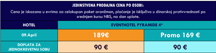 Sastanak grupe u 20:15 h (radi preuzimanja obezbeđene peronske karte) na platou ispred glavnog ulaza na beogradsku autobusku stanicu „BAS“, koja se nalazi u Bloku 42 na Novom Beogradu, Ulica antifašističke borbe br. 46– 48 (ukoliko davalac usluga BAS drugačije ne odredi). Predviđeno vreme polaska je u 21:00 h. Vožnja preko Novog Sada, Subotice i Mađarske sa kraćim usputnim zadržavanjima radi carinskih formalnosti i odmora.
