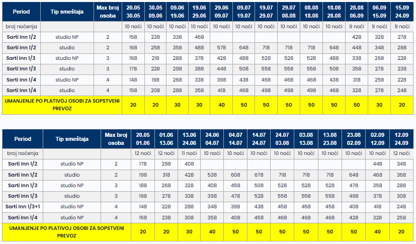 Prodaja u svojstvu subagenta – Cenovnik Sarti Sarti Inn Leto 2026